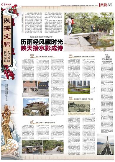 历雨经风藏时光,映天接水影成诗。珠海历史名人研究会会长吴流芳表示:“古桥一头贯穿江河,一头联结古今,作为城乡的重要交通纽带,不仅促进着城乡经济发展,同时也成为地方的形象特征,起到地域的文化符号、人文景观的作用,是矗立于岭南大地间的珍奇瑰宝。”
