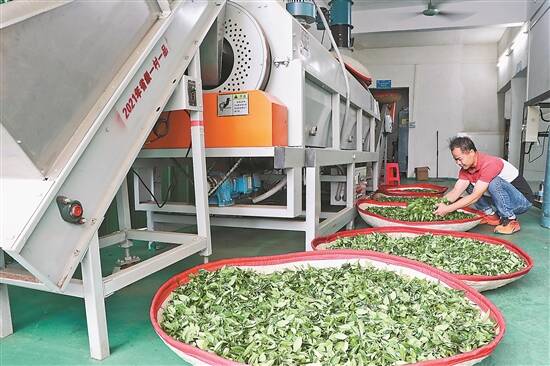 山上茶农采茶忙,山下茶厂制茶香。在新陂生态茶园专业合作社生产厂房内,工人正在加工刚采摘回来的新鲜茶青,经过晾晒、杀青、揉捻、烘干、柴火提香等工序后变成干茶,并及时将新鲜出炉的成品干茶打包送往客户手上。“当天采的茶青必须当晚赶制出来。”王伊军告诉记者,有些客户为了品“第一口鲜”,专门前来生产厂房“督工”,或在家等到晚上12时。