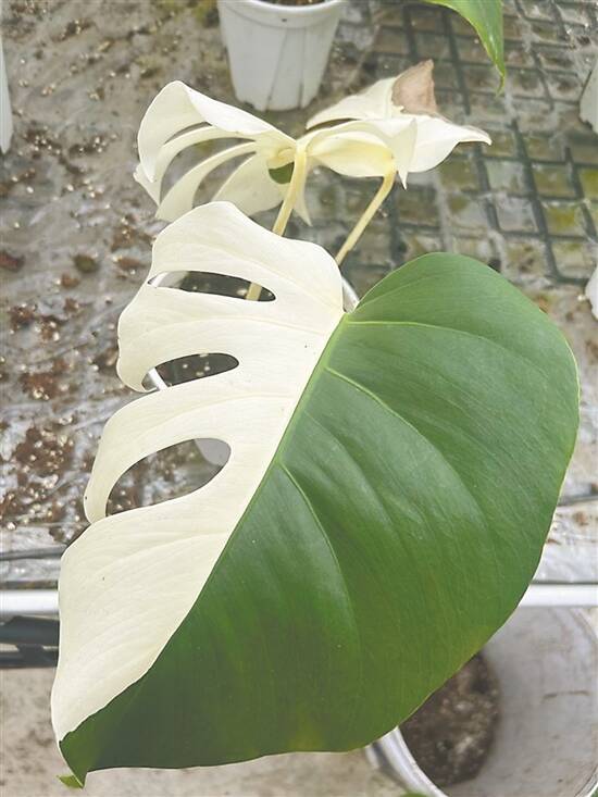 在热带植物中,尤以“锦化”品种最为稀缺。所谓“锦化”,是指一株植物在绿色叶片中心或边缘生长出白色或黄色的斑纹,这种“缺憾”带来了不可复制的美丽,成了玩家竞相追逐的奇货。在热植圈里,一盆普通的龟背竹可能只需要几十块钱、上百块钱,而锦化后的龟背竹,一片叶子可能就达到上千元、上万元。