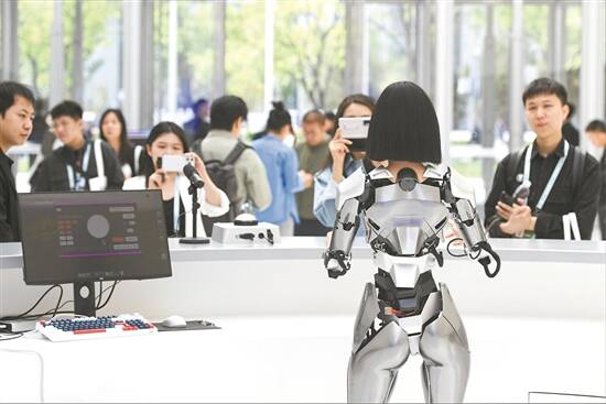 4月24日,仿生人形机器人在中关村国际创新中心的咨询台“迎宾” 图/新华社