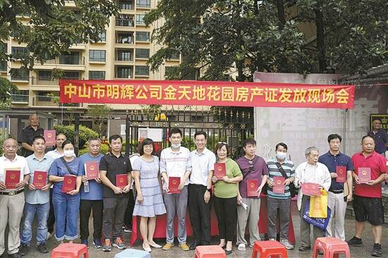 羊城晚报讯 记者张德钢,通讯员陈嘉宝、尹浩摄影报道:5月21日,中山三乡镇金天地花园外人声鼎沸、鞭炮齐鸣,在中山市明辉公司金天地花园房产证发放现场会上,百余户金天地花园的业主终于拿到属于自己的“大红本”(不动产权证)。中山市信访局副局长贺顺群、三乡镇党委副书记欧阳永恒参加发放仪式。