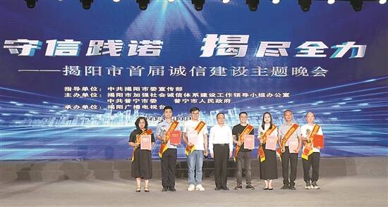 本次活动由揭阳市委宣传部指导,揭阳市加强社会诚信体系建设工作领导小组办公室、普宁市主办,揭阳广播电视台承办。活动由揭阳市发改局牵头、揭阳全市各地各单位推荐,经择优推荐、严格审核和社会公示等层层筛选,共有7名个人和12家企业获得了揭阳市首届“诚信之星”的光荣称号。