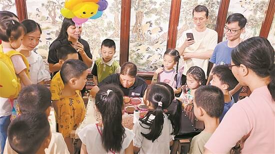 潮州历来就是崇文重教之地,素有海滨邹鲁、岭海名邦之美誉,非遗文化丰富多彩,有刺绣、剪纸、麦秆画、陶艺、潮彩等等。小朋友在爸爸妈妈的陪伴下,参观了百师园展馆。馆内精美的作品和老师绘声绘色的讲解,让小朋友们进一步了解潮州非遗文化、工艺美术和传统文化,小朋友在喜欢的精美展品前面驻足欣赏,拍照留念。