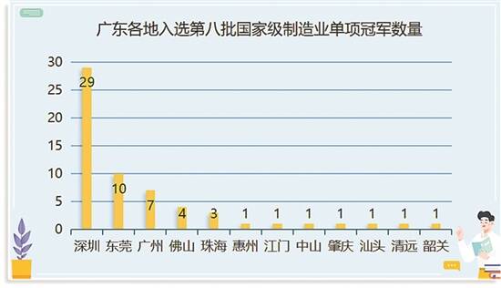 记者梳理发现,从区域来看,第八批入选的粤企主要集中在珠三角地区。其中,深圳29家、东莞10家、广州7家、佛山4家、珠海3家、惠州1家、江门1家、中山1家、肇庆1家。特别是深圳,单批入选数量再创新高,新增数量居全国城市第一;累计总量95家,仅次于宁波,居全国城市第二。