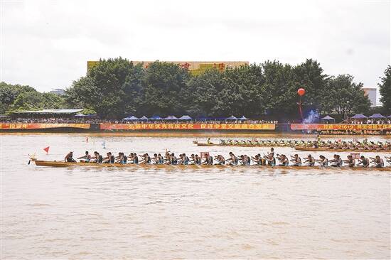 当天上午,比赛还未开始,中堂水道两岸早已挤满了前来观赛的市民和游客,许多市民已经早早抢占了在树荫下观赛的绝佳位置。随着一声令下,一艘艘龙舟似出水蛟龙冲出赛道,龙舟“扒手”们劈波斩浪,喊着口号,挥舞桨叶,你追我赶,激起层层浪花翻腾。岸边的“观战者”们振臂欢呼,为自己喜欢的队伍呐喊加油。