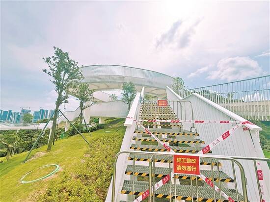 羊城晚报讯 记者宋王群摄影报道:6月7日,总投资20亿元的深圳光明区科学公园正式对外开放,凭着深圳北部新地标,世界一流科学公园等头衔和美誉,吸引了不少市民前往“打卡”。然而近日陆续有市民反映,该公园山顶观景栈道桥面锋利。18日,羊城晚报记者现场采访获悉,目前该公园山顶观景栈道已封闭。光明区建筑工务署方面回应,整改方案正在研究制定中。