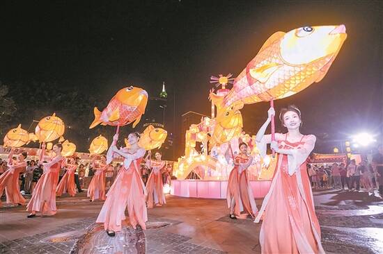 “洗过塔坡水,顺风又顺水”,塔坡庙会上,市民游客与“佛山初地”进行穿越千年的对话;龙狮舞动、鱼灯游走,佛山古镇灯会展现岭南风华;民间文化艺术荟萃的秋色巡游,燃动全城;一场隆重的佛山古镇岭南风尚婚礼,将整个城市带入了甜蜜浪漫时光……