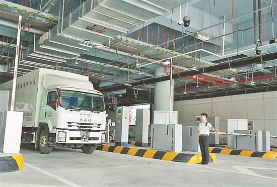 上午9时一过,随着粤澳联合一站式车道右前方电子屏上两地5家联检单位名称前的指示灯由红色变为绿色,粤澳分界线上的防冲撞柱降落,道闸打开,一辆装载着澳门物资的车辆经横琴口岸通关进入横琴粤澳深度合作区。
