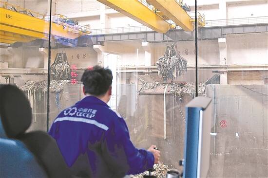 工作人员操作垃圾吊抓斗将垃圾投入燃烧炉 新华社发