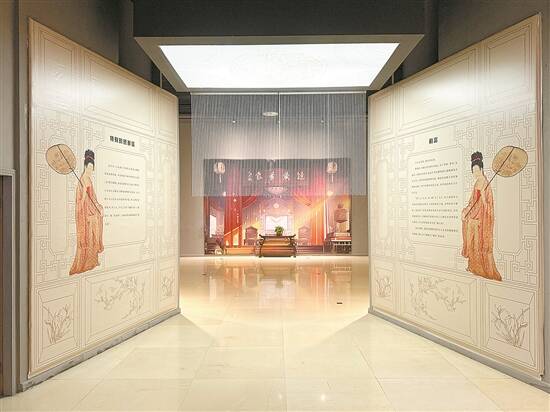 亦有数不胜数的诗词描绘女子对镜梳妆。在“镜藏万象”展的第二部分空间设计中,呈现了“在水一方”“宫闱庭院”“贞洁内室”三个场景,并由带有铜镜描述的诗词句子串联起前后两个部分,同时充盈了场景的内容感。文字带来的画面联想力不容小觑,如“当窗理云鬓,对镜帖花黄”“照花前后镜,花面交相映”,这是大部分游客熟悉的佳句,无须多介绍,一瞬便让人联想起代父出征的花木兰,或闺中女性对镜簪花时娇颜胜花的魅力画面。