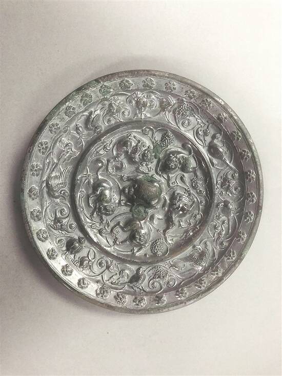 海兽葡萄纹铜镜纹饰华丽繁缛,构图分内圈、外圈,富有神秘气息。主题纹饰是高浮雕海兽纹和葡萄纹,海兽或扬尾曲体,或展肢张身,生动形象,葡萄枝繁叶茂、硕果累累。