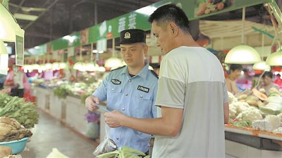 在台山首个“反诈菜市场”内,民警向群众宣传防范电信诈骗知识