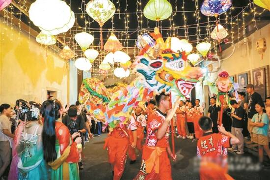 “火树银花合,星桥铁锁开”“东风夜放花千树,更吹落,星如雨”等观灯夜游场景,在百年客家围屋鹤湖新居再现,现场不仅有汉服游园、诗词吟诵、民乐表演等传统文化活动,还注入了诸多新潮元素,如龙岗音浪环城计划激情唱响,十八纸文创、大芬油画、甘坑扎染等作品展示,为外界了解龙岗提供了一个“宝藏入口”。
