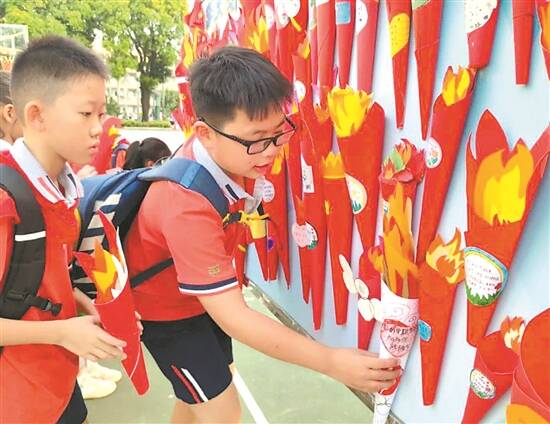 其中,蓬江区杜阮镇龙岭小学开展了“传承奥运精神 砥砺强国之志”主题开学礼。同学们戴着自己制作的奥运主题科技帽兴高采烈地走进校园,并把提前写好的心愿卡,贴在心愿墙上。