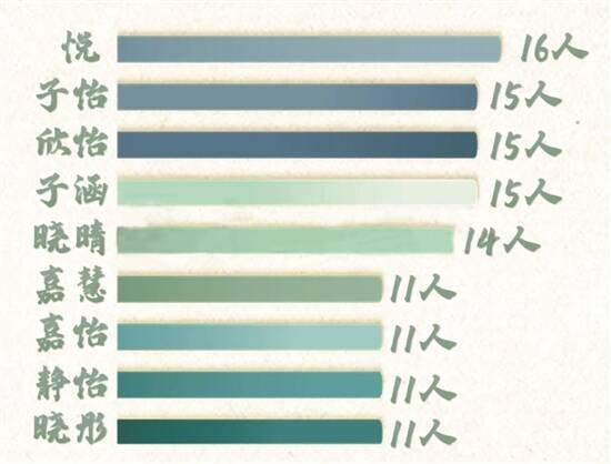 “子涵”“子怡”无疑是新生的“爆款”名字,此外,暨南大学新生中名字为“安琪”“博文”“晨曦”的较多。广东外语外贸大学同名(非同姓氏)人数排名前五(含并列)的为“悦”“子怡”“欣怡”“子涵”“晓晴”等。