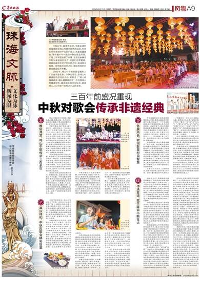 中秋时节,黄昏将至时,平静安逸的珠海高新区鸡山村便开始热闹起来,村民们早早来到村中心的广场上,大家面露喜色,等待着一年一度的中秋对歌会开场。广场上早早摆放好了长凳,这是给参赛选手和长者就座的地方,村民们自带凳椅,根据自家所在村子的东西方位,组成两大阵营。待到皓月当空之时,精彩热闹的对歌会就会拉开序幕。