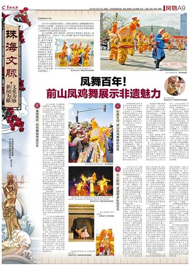 前山凤鸡舞,俗称“耍凤鸡”,是流传于珠海前山地区的一项民间舞蹈艺术。2009年,“前山凤鸡舞”被列为市级非物质文化遗产名录;2013年,被列为省级非物质文化遗产名录。近年来,前山凤鸡舞这一古老的民间艺术焕发新生,巡游、表演等多个场合都能见到它的身影,前山凤鸡舞不仅表达了人们向往美好生活的愿望,更向世界展示了中国非遗传承的魅力。