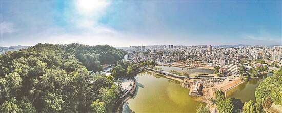 从高空俯瞰,古城生态资源丰富,“江沥河湖岭”一应俱全。古城“依水而建、因水而兴”,东江绕城而过,滋养着一代又一代古城人民;东江边,葫芦岭古时是居民祈福、文人游憩之地,如今成为了休闲娱乐场所;葫芦岭下,金湖、银湖波光粼粼,流传着金银姐妹的忠烈贞节故事;榕溪沥、北门河静静流淌,是古城的生态廊道,一派生机盎然。
