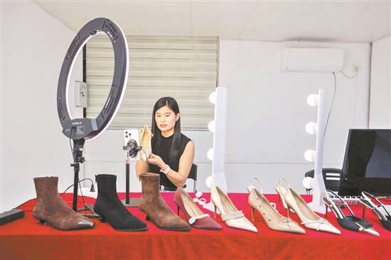 “推广中心以微信公众号、视频号、抖音、微博等主流媒介为推广渠道,开通‘惠东女鞋’宣传账号,加强惠东女鞋综合形象对外渠道输出建设。”惠东县电商协会秘书长顾斌介绍,全域销售中心的展厅可以展出5千到1万双鞋,通过直播的形式,帮助鞋企或鞋厂销售现货产品。同时建立了VR线上展厅,采购商只需扫描二维码,便能如同亲临现场般在线上参观鞋企、展厅及浏览各类产品。