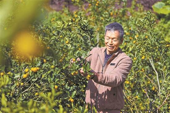 走进位于乾务镇的林青果场,清新果香扑面而来。冬日暖阳洒下,一个个圆润的脆皮金桔在绿叶的掩映下,闪烁着诱人的光芒。果场负责人林伟足手提剪刀、桶子,穿梭在果树中,忙碌地采摘、装箱,丰收的喜悦洋溢在脸上。