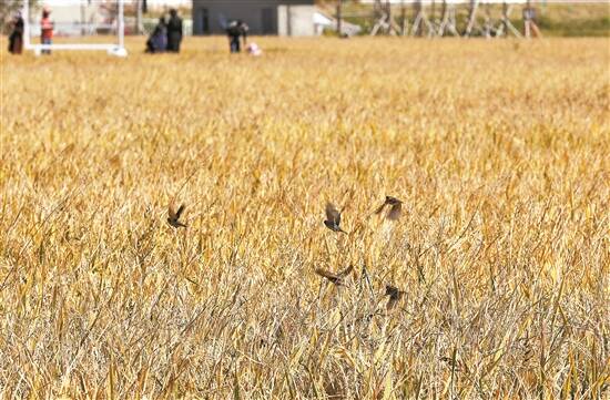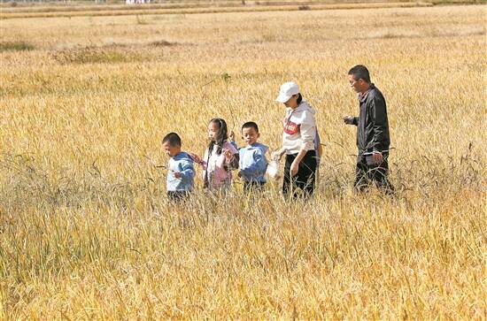 这片金黄的稻田不仅是粮食生产的重要基地,更成为了深受市民喜爱的生态游打卡地。周末时光,许多家庭带着孩子们来到这里,感受农耕文化的魅力。孩子们手持小镰刀,在农民婆婆的指导下小心翼翼地收割稻谷,并通过老式脱粒机将收割的稻谷现场脱粒,体验收获的喜悦。市民马先生笑着说:“我很喜欢这种生态游,来这里放松一下,孩子们了解农耕文化的同时也能体验到收获的乐趣。”田埂上,孩子们自由奔跑嬉戏,尽情享受与大自然亲密接触的快乐时光,为都市生活增添了一抹温馨的色彩。