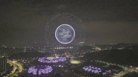 与大运演唱会一同屡屡出圈的“印象龙岗”无人机编队表演,持续强化了“趣龙岗·有意思”的城区形象。从薛之谦演唱会上“天外来物”“抢戏”,到周杰伦演唱会的浪漫气球升空,张杰演唱会呼啸而过的“大运号”列车,李荣浩演唱会时被鲲鹏“硬控”,再到张韶涵演唱会的天使翅膀,一次次契合演唱会主题和歌手成名曲的“梦幻联动”,制造了无数令歌迷难忘的瞬间。