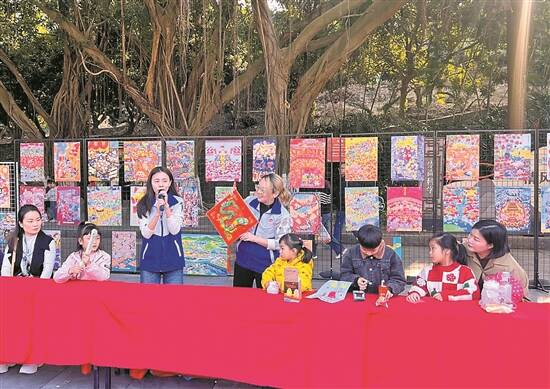 在黄旗山城市公园的榕树下,文化志愿者带领企业职工家庭欣赏年画,并生动讲解画中故事,让年画化作一本鲜活的“教科书”,在传统年画中品味乡村振兴、科技创新、生态文明建设等新时代元素,直观感受社会的发展与进步,传递积极向上的生活态度。