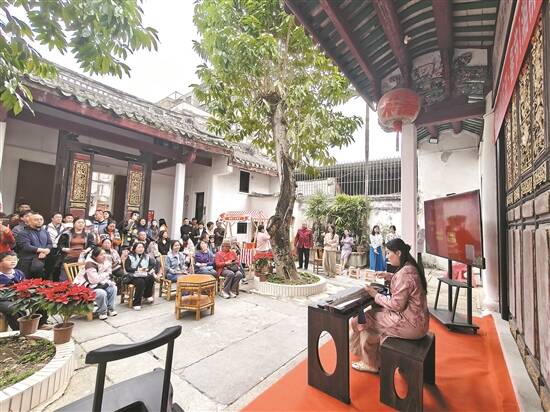 在古城内的湘桥区非遗中心,一场场惠民演出正精彩上演。记者日前在该中心看到,一场悠扬的古琴表演正缓缓拉开序幕。人们在古朴的非遗中心内听古琴、品工夫茶、吃朥饼。热闹繁华的古城内,一片安静惬意的图景便被勾勒而成。