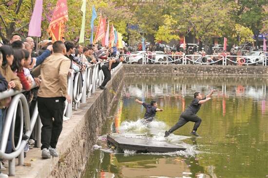 记者在现场看到,抢炮区域被划分为陆地奔跑区、池塘浅水区及观礼台瞭望区三大区域,每个区域都自成一片热闹非凡的景象。在陆地奔跑区,随着炮头的发射,参与者们如同离弦之箭般冲向炮头落地的方向。他们中有身着运动装的年轻人,也有身手矫健的老年人,大家在这传统与现代交织的赛场上展开了激烈的角逐。每当有人捡起炮头,周围便会响起一片欢呼声和掌声,而那些未能抢到炮头的人则迅速调整心态,准备迎接下一个炮头的落下。
