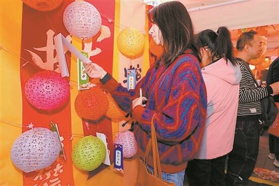 为欢度传统佳节,营造欢乐、祥和的节日氛围,元宵节当天,活动开展了猜灯谜抽奖活动。灯谜内容巧妙融入了福彩和广府元素,如“采得三片叶”打一“彩”字,“花开叶不在,花红叶不绿”打一花卉“木棉花”等。市民、游客猜中可以赢得一次抽取元宵喜乐签的机会,礼品包括庙会特别定制“把福‘袋’走”购物袋,福气贴贴抱枕等福彩文创和福彩刮刮乐即开票,让大家在感受佳节传统乐趣的同时,把“福”带回家。