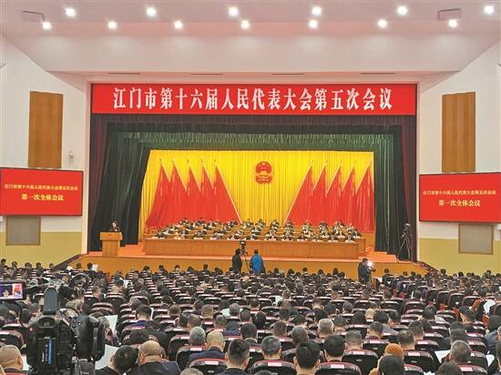 江门市十六届人大五次会议26日上午开幕。江门市市长吴晓晖作政府工作报告。报告提出今年江门地区生产总值增长目标为5.5%左右。