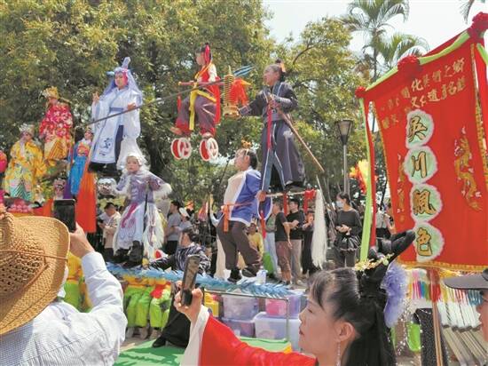 当天13时,庙会大巡游启动,109支巡游队伍宛如一条流动的文化长河,沿北帝古庙、王大中丞祠、绮云书室等10处历史遗迹依序行进,绵延4公里。队伍中既有国家级非遗——潮汕英歌舞的雄浑呐喊、吴川梅岭飘色的凌空绝技,又有深圳盐田鱼灯舞的流光溢彩,形成一幅“非遗清明上河图”。