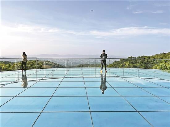 游客在广州山谷国际旅游度假区“天空之镜”打卡