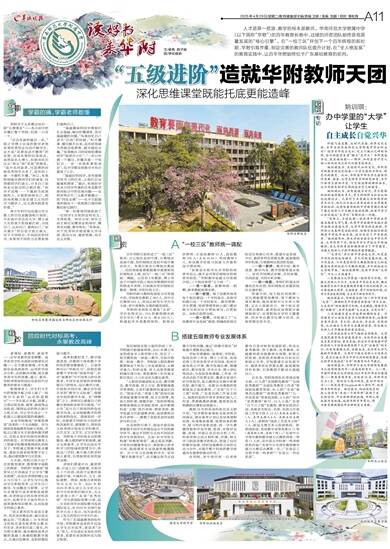 在华附,老中青任何一位老师都有自身对标的发展阶段,形成从新秀教师、骨干教师、优秀教师、卓越教师到功勋教师全周期、阶段式的发展,各阶段老师都有目标定位和核心任务,学校搭建专业发展平台、提供多样化资源支撑、配套激励评价机制,引领教师不断成长超越自己。