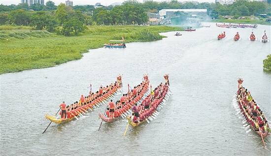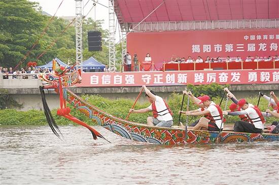 今年6月1日,榕江南河的江面上激流涌动,鼓声如雷,揭阳市第三届龙舟民俗文化周主会场活动如约而至。第三届龙舟民俗文化周以“赛龙夺锦,力争上游”为主题,延续前两届的精彩,再度为市民和游客奉上一场集龙舟竞渡、民俗展演、文旅体验于一体的文化盛宴。除了龙舟竞渡,在揭阳榕城区东湖公园广场,青狮、龙舞、英歌等非遗项目轮番登场,让市民近距离感受传统文化的魅力。此外,还有深受年轻人喜爱的非遗文创市集、特色市集、文创展销等活动同样精彩,借助龙舟活动“流量”带动消费“增量”,已成为揭阳文旅体育的一张亮丽名片。