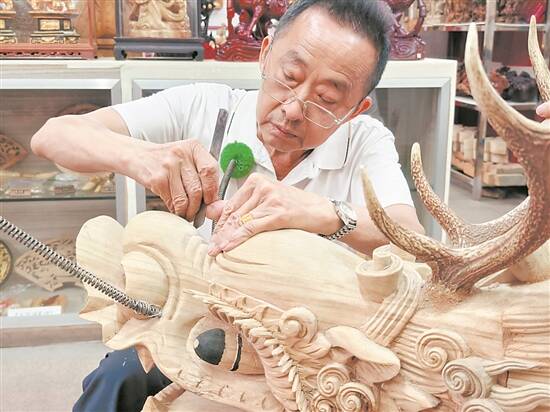 走进中国工艺美术师、揭阳木雕大师林养武的工作室,各式木雕作品琳琅满目。而其中最为吸睛的是龙舟龙头。龙头色彩鲜艳,气宇轩昂,神威凛然,霸气十足却又灵动可亲,生动地展示着揭阳底蕴深厚的非遗文化与巧夺天工的木雕技艺。