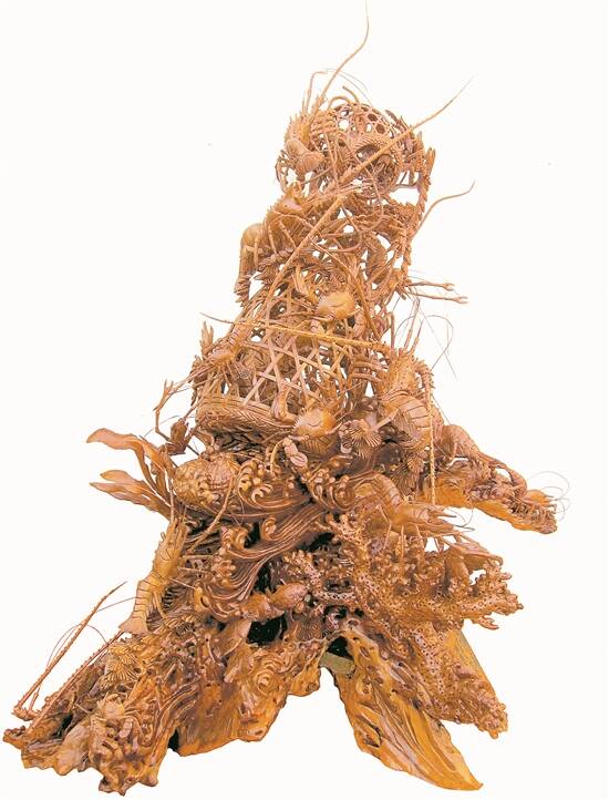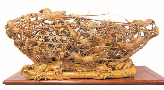 通雕技艺的巅峰代表,正是蜚声海内外的《龙虾蟹篓》。它源自清代揭阳“木雕状元”黄开贤首创的《半畔蟹篓》。经惠来历代匠人呕心沥血的传承与革新,这一题材实现了脱胎换骨的飞跃:从最初的单面观赏建筑构件,演变为可360度环视的立体艺术珍品;篓体结构从单一篓筐,发展至令人叹为观止的九层相叠;形态也从简单的叠罗汉,变幻出横卧、斜悬、倒垂、吊挂乃至精巧绝伦的“篓套篓”等多种样式。