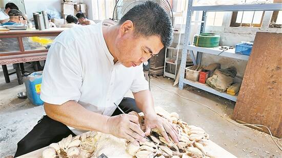 “惠来地处沿海,在沿山海滨建有许多庵寺、古塔、阁等,其中留下众多的木雕,呈现着各个历史时期的木雕艺术。特别是惠来籍在外仕官商贾,当他们殊途归来,为了光耀祖裔,造祠建第,将文化思想和精神寄托以木雕的形式融入建筑。而这些有形的木雕艺术渗透了异地的人文地理特色,又有较强的时代特色、区域特色、人文景观特色。各种流派结合的特色,体现了深厚的历史文化底蕴。”国家级非物质文化遗产项目潮州木雕代表性传承人、正高级工艺美术师陈德丰告诉记者。