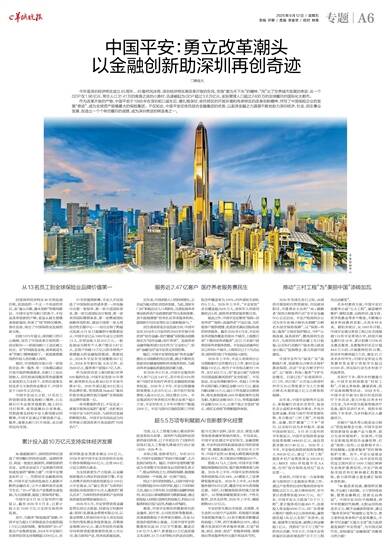作为改革开放的产物,中国平安于1988年在深圳蛇口诞生后,便扎根深圳,依托特区的开放环境和传承特区的改革创新精神,抒写了中国保险企业的发展“奇迹”,成为全球资产规模最大的保险集团。不仅如此,中国平安还依托综合金融集团的优势,以澎湃金融之力源源不断地助力深圳经济、社会、民生事业发展,创造出一个个举世瞩目的成绩,成为深圳奇迹的缔造者之一。