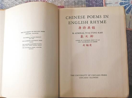 1932年,芝加哥大学出版社推出了蔡廷干历时多年完成的《唐诗英韵》。这是一部由中国本土学者独立完成的英译中国诗集,收录了译自《千家诗》的122首五言和七言绝句。