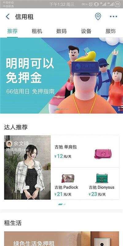 大家常说,女人的柜子里永远少一件衣服,但对于麦小姐来说,她的柜子里永远少一个包包。 有些人喜欢收集各个朝代的古董,有些人喜欢收集各种色号的口红,而麦小姐偏偏喜欢收集各个牌子的包包。 是的,麦小姐就是一个名副其实的包包控。对于每个包的样式特点、材质重量,甚至金属配件,麦小姐都能说得头头是道。每天背着不同的包包出门成了她生活的一个小乐趣。 然而,世界上有一类东西叫做奢侈品,有些包包也位列其中。 对于那些奢侈品包包,麦小姐只能望洋兴叹。哦,忘了说,麦小姐每个月拿到手的工资只有四千多。 从多年前开始,她就盯上了一个dior的戴妃包,甚至在想要不要豁出去咬个牙入手,结果托朋友去巴黎一询价,麦小姐立刻把这个念头打消了:4万多!就是把牙齿咬碎了,也不可能下手啊! 尽管工资卡对这个包包无能为力,但麦小姐还是禁不住地日思夜念,牵肠挂肚。她想,哪怕就一次让她背上这个包包,她也此生无憾了。 最近,麦小姐如愿以偿了。她在支付宝平台上找到了信用租,租到了自己心仪的包包。 刚开始,麦小姐也很难相信奢侈品可以租赁,直到她无意中进入了芝麻生活的信用生活界面,一个新世界向她展开大门。 看到租赁包包的页面,麦小姐的眼睛简直快要发光了,LV、Chanel、GUCCI等名牌包包应有尽有。每点开一个包,里面都有详细的商品图片,乍一看跟购物界面没什么两样。租赁一般都是按天算的,有7天、15天、30天等套餐可供选择,下面还有关于租包时间计算、如何归还的详细解释。麦小姐忐忑地点开了自己的免押额度,进行了信用评估,却意外地发现自己的信用非常好,可以免押金租赁。在此之前,麦小姐一直担心押金问题,害怕光是押金就花去一大笔钱。 麦小姐很快就找到了自己梦寐以求的dior戴妃包,她尝试着下了一个七天的租单,整个流程就像淘宝购物一样简单,发货还很快。因为不用押金,麦小姐最终只花两百多块就背上了心仪的包包。 麦小姐说,几十块钱的租金,其实比洗包包的钱还便宜。她之前去各大洗包包平台,洗一只包需要消毒、清洁、打蜡,一系列手续下来没有几百块完全搞不定。另外,一些奢侈品包包很容易磨坏,一磨坏就要花几百上千块钱,又费钱又心疼。现在用租来的包,还不用承担洗包包费,天天用新包,感觉人生无往不利。 除了包包,信用租里还有很多品类可以租,麦小姐抱着玩一玩的心态,又尝试着租了一件衣服,流程与租包包差不多,就像淘宝买衣服一样简单。但麦小姐放下手机就有点后悔了,她不知道租来的衣服到底干不干净。正当麦小姐在犹豫的时候,衣服已经发货了,隔天就到了麦小姐的手中。等到拆开包裹的那一刻,麦小姐惊呆了:衣服包装非常完美,几乎和干洗店拿回来的一模一样;衣服非常干净整洁,还附上了质检的结果……麦小姐开始喜欢上信用租了。 自从发现了支付宝这个新功能,麦小姐就跟发现了新大陆一样,除了衣服包包,其他一些东西也开始尝试在平台上租赁,包括家电、图书、数码产品等等。麦小姐发现,很多她之前无法负担得起的产品,都可以通过租赁享受。麦小姐想要一个单反很久了,平常喜欢旅游的她,觉得手机拍摄无法满足自己的需求,但因为价格较高而且用得到的地方较少,麦小姐也只是想想而已。然而,通过信用租,麦小姐租到了一台单反。租单反的流程也是很简单,页面上的说明都很详细,包括租期、流程和参数,有些还有网友的评价做参考。麦小姐每次根据自己的出行需要搭配合适的单反,甚至还会租下无人机来拍摄,麦小姐觉得自己的生活层次一下子提高了多个档次。 麦小姐说,像单反自己也就是平时旅游的时候会带出去,用到的机会比较少,选择租赁再合适不过,既不会经常闲置造成资源浪费,也能满足自己的偶尔的需要。另外,自己住的房子地方较小,平时也不好堆积太多东西,租赁可以解决很多收纳和储存问题,家里再也不用被杂物堆满了。 尝到了租赁生活的便利,麦小姐一直在向朋友们疯狂安利这个功能,也得到了很多朋友的认可。麦小姐现在已经习惯了“万物可租”这种全新的生活方式,这种环保又便捷的高品质生活方式,深深俘获了她的心。 现在,像麦小姐这样选择“万物可租”生活方式的年轻人越来越多。据芝麻信用的相关调查显示,有73%的用户对租赁持开放态度,其中,95后、高学历、未婚无房的学生和白领更乐于接受租赁生活。他们年轻,喜欢尝试新鲜事物。虽然收入不算太高,但是他们愿意在生活品质上投资。在他们看来,及时行乐的使用权比天长地久的所有权更为重要。用他们的话来说,人就要活在当下,与其压抑自己欲望,不如解放自己的天性。东西是租来的,喜悦是自己的,实惠是实在的。 租赁,最头疼的是押金问题。以前,大部分租赁存在风险高、易惹纠纷等问题,所以平台光是押金就已经相当于原价,吓退了很多潜在用户,像奢侈品这种根本没有租赁的可能。信用的介入,让一部分租赁开始免除押金,大幅度降低了用户的使用门槛。从去年开始,越来越多的行业加入到免押租赁的服务场景,包括租房、租车、共享单车、便民服务、服装、数码设备租赁等10大行业,打破了“不收押金就不可能生存”的旧观念。就拿奢侈品来说,因为免押租赁的存在,让无数像麦小姐这样收入平平的普通人也能过上自己想要的消费生活,让商品真正发挥它应有的价值。 现在,麦小姐每