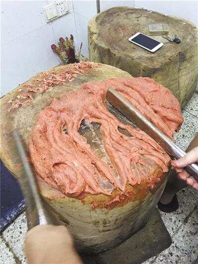 ◀只有花人力功夫捶打,牛丸的肉筋才会彻底分离,吃起来才更加爽口 |