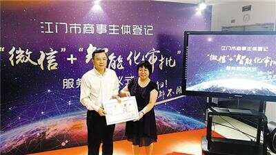 江门市副市长蔡德威颁发首张“微信+智能审批系统”发出的营业执照 |