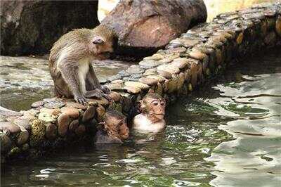 猴子组团在私家游泳池玩水 |