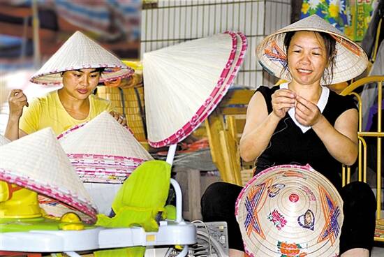 南山镇漫江居委三队村的归侨妇女编织越南帽子 |