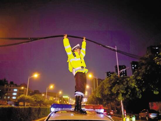 羊城晚报记者 郑诚 通讯员 钟显强 台风过境,南海区里水大道路段的电缆被大风刮倒拦路,途经车辆渐渐排起了长龙。暴雨中,南海公安分局一名辅警站上警车车顶,托举电缆一个多小时,保证车辆顺利通行。 8月25日,受台风“白鹿”影响,南海区多个镇街普遍刮起大风下起大雨,约16时20分许,一条横跨里水大道南沙涌路段的电缆被大风刮了下来,途经车辆需小心翼翼绕开电缆,对道路交通造成严重影响。接报后,南海公安分局交警大队里水中队迅速派员前往现场处置。辅警黄志安、邵有为赶到现场,发现电缆下垂最低部分仅仅离地面约1米多,并横跨了整条主干道,严重影响车辆通行。执勤人员迅速对道路车流进行疏导,指挥车辆绕过电缆缓慢通过,并将情况上报指挥中心联系相关部门前来抢修。 暴雨中,由于电缆下垂最高部位离地面也仅有2米多,小汽车在指挥下可缓慢通过,但途经该路段的货车却无法通过。到了傍晚时分,道路上积压的货车数量越来越多,在附近路段执勤的里水中队副中队长关务安带领辅警彭一海、郭浩威、梁伟常到现场增援,对现场交通情况进行重新分析研判,并迅速安排增援执勤人员对路段进行管控疏导。 由于现场条件所限,难以找到竹竿、梯子等替代物撑起电缆。为尽量加大车辆的通行能力,避免发生大面积拥堵,辅警彭一海灵机一动,想到利用旁边的警车暂代。于是,彭一海马上叫同事将警车开到电缆下面,自己站上警车车顶,用手将通信电缆拉紧举起,道路瞬间畅通。在路段上等待通行已久的司机和路过市民纷纷鼓掌并竖起拇指点赞。 从19时20分许,一直到20时40分许,长达一个多小时的时间里,彭一海一直托着电缆并指挥车辆通过。直到抢修人员赶到现场处理好掉落的电缆,道路恢复畅通,已是21时许,彭一海和同事才离开。