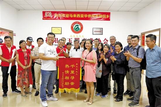 蔡文泰(前排接受锦旗白衣者)热忱帮助海外华人寻根认亲 |
