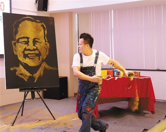 文/图 羊城晚报记者 秦小辉 通讯员 陈凤娟 8月28日,“演画”创始人、当代艺术家黄凤荣“再创世界名画100”全球巡展在东莞桥头力嘉集团举行。画展上,黄凤荣不仅现场作画,还分享了他《再创世界名画100与印象中国56》的创作心得。“我的特点就是看一眼就能把你画出来。”8月29日,黄凤荣接受羊城晚报记者采访时表示,每个时代都会造就不同风格的艺术家和作品,任何艺术家和作品不可能强求雅俗共赏,但作为艺术家,就要不断地探索、创新,不怕失败。 现场作画带给人以快乐和活力 28日下午,当激昂的音乐声再次响起,黄凤荣双手拿着画笔,左右开弓,身体也随之有韵律地摇摆。不一会儿,面前的白纸上,现场嘉宾的肖像就开始跃然纸上。所画肖像或笑容满面,或谦和儒雅,颇为传神。 “我希望通过我的创作表演,把现场每个观众的情绪都调动起来,让他们热血沸腾,带给他们创作的快乐和活力。”黄凤荣告诉羊城晚报记者,是互联网“无界”时代让他想到将绘画与表演相结合,并巧妙地实现了绘画和表演的跨界融合,创造了独具一格的表演画派“演画”。同时,黄凤荣提出了“1+1=3”的跨界艺术概念,即“绘画+表演=演画”“绘画+直播=画星”等艺术形态。 记者了解到,但凡杰出的画家均有自己所擅长的本领,像齐白石擅长画虾,徐悲鸿擅长画马。“我的特点就是看一眼就能把你画出来。”黄凤荣说,每个时代都会造就不同风格的艺术家和作品,任何艺术家和作品不可能强求雅俗共赏,但作为艺术家,就要不断地探索、创新,不怕失败。同时,黄凤荣也认为,现在随着沙画、涂鸦、二次元等新生代事物和人群的兴起,沙画画家、涂鸦画家、二次元画家等艺术家群体也在壮大,因此,人们对各种艺术形式的评判和审美眼光应该保持开放精神。 专注创作但也希望与产业融合 据了解,本次展览共展出了106幅黄凤荣的拼贴画,作品以彩色贴纸作为主要材料,有蒙娜丽莎、街景、人物、植物等,都给观众不一样的视觉冲击。 为何会想到做拼贴画?据黄凤荣介绍,自2015年起,他就多次收到桥头力嘉方面的邀请,参加“演画”表演,并进而知道力嘉是一家做环保包装印刷的企业。后来就想能否将一些旧的杂志、报纸撕碎,然后组成一幅画。结果一尝试,发觉效果还蛮好的。因为旧的报纸、杂志本身就是一种文化的载体,当人们在观赏一幅拼贴会的同时,又能留住杂志、报纸所刊载的历史和文化,拼贴画作品肯定会更具内涵和文化性,而且在小朋友和喜欢艺术的人眼里,也会觉得很新奇,从而培养人们发现美的眼睛。 “现在力嘉方面想将参展的部分作品印刷在包装盒上,目前已经有了初步的产品。”谈起文创产业,黄凤荣坦言,自己目前还是专注于创作,但也希望自己的绘画作品能很好地与包装产品融合。在当天活动现场,东莞市社科联党组书记、主席,社科院院长王炜东也表示,力嘉集团与黄凤荣的合作,实现文化品牌的共建共享,必定能擦出不一样的火花。 据了解,桥头镇是中国环保包装产业名镇,力嘉国际作为桥头环保印刷领域的佼佼者,近年来,不仅打造了包装印刷博物馆、创意设计展厅、创客空间等文化场地,还积极举办各类文化活动,为桥头文化及包装行业发展注入了新的活力。
