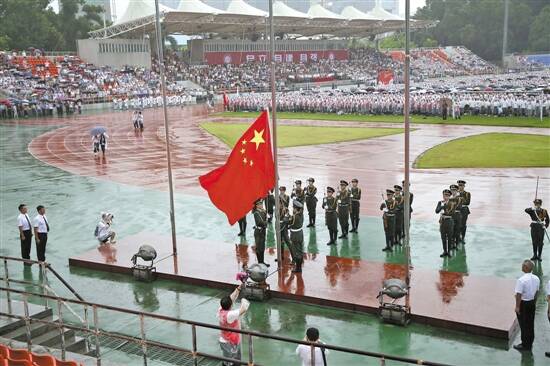 文/图 羊城晚报记者 沈婷婷 连日来,深圳各高校陆续开学,哈工大(深圳)开学第一课主讲家国情怀,2226名2019级新生发出青春宣言,高歌《歌唱祖国》;南科大举行2019年开学典礼歌唱《我和我的祖国》,开学第一课讲“为祖国的强盛,创新奋斗”;香港中文大学(深圳)校长徐扬生教授致辞鼓励同学们立志担负时代责任;9月2日,深圳大学3万师生在暴雨中齐唱国歌,燃爆整个荔园,登上微博热搜…… 三万护旗手雨中升国旗唱国歌 9月2日,深圳大学后海、西丽校区同时举行“我为祖国升国旗”主题教育活动,约三万深大师生在雨中举行升旗仪式,齐唱国歌。 7时45分,后海、西丽校区全体教职员工及学生在细雨中齐聚,静候升旗仪式开始。8时整,在全体师生见证下,国旗护卫队手执五星红旗,在雄壮的《义勇军进行曲》旋律中,五星红旗冉冉升起。仪式过程中突下暴雨,却无法浇熄深大师生火一般热烈的爱国情怀,全体师生在雨中齐唱国歌,场面庄重,令人动容。国旗在空中飘扬,三万师生整齐呐喊“我和国旗同框,我爱中国”! 深大党委书记刘洪一和校长李清泉分别在两校区进行了国旗下的讲话,号召深大师生不忘初心、爱国爱家。 高校陆续开展“家国情怀”教育 连日来,正是深圳各高校开学的日子,各校纷纷举行开学仪式,并讲授特色“开学第一课”。 9月1日,哈工大(深圳)举行开学典礼,2226名2019级新生共同许下青春宣言,典礼上,他们还进行了一次“合唱快闪”,挥舞国旗高歌《歌唱祖国》。当天,香港中文大学(深圳)也举行了2019年度新生入学典礼,2100余名新生参加。 香港中文大学(深圳)校长徐扬生教授鼓励同学们要先“立志”,成为有志气,有担当,有抱负的青年,并要将个人的发展与国家、社会乃至世界人类的发展联系在一起。 9月2日,南科大1062名本科新生、1139名研究生和18名本科国际留学生精神抖擞地参加了开学典礼,典礼后,南方科技大学党委书记郭雨蓉为全体新生上了题为“为祖国的强盛,创新奋斗”的“开学第一课”。郭雨蓉激励全体新生,将个人的理想和国家发展结合起来,找到自己的时代坐标。 北京大学深圳研究生院2019年开学典礼在大学城体育中心体育馆举行,今年迎来了1271名新生。校长詹启敏建议同学们要脚踏实地、埋头求学,以坐冷板凳的精神做学问;放眼寰宇、志存高远,在学习思考之余确立自己的志向,实现人生价值。