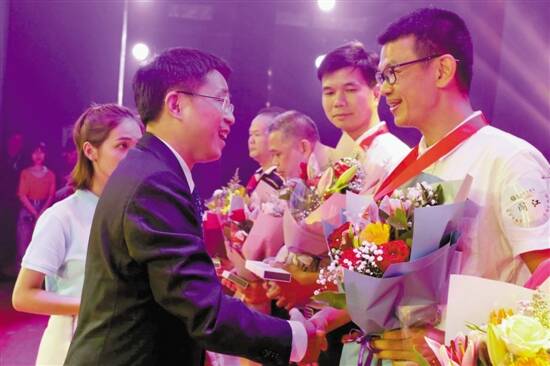在学校建设新型高水平理工科大学的关键时期,新进教职工肩负着新使命。2018年9月1日以来,学校新进教职工167名。新进教职工们有序地登上舞台,为自己佩戴校徽。在全场师生见证下,新进教职工进行了庄严的入职宣誓。今年学校还为每位新进教职工准备了一份意义非凡的礼物——莞工特别定制款丝巾。丝巾由该校文化产业系陈昱甫老师设计,其图案主要运用了莞工校徽以及人才之星两个元素,以重复排列的方式凸显教师如树木般扎根莞工的意象,四周以一圈箭头图案装饰,意寓莞工与教师队伍同行共进。正中心铭刻校训“学而知不足”,学无止境,学生如此,教师同样如此,期望教师们未来可以更上一层楼。 大会上,学校还进行了20年校龄教职工致谢礼,向校龄满20年的教职工致以最诚挚的感谢与祝愿。满溢芬芳的鲜花、专属定制的手表、精心定制的20年纪念章,这是学校对这一批校龄满20年的教职工的衷心感谢。得利钟表有限公司总经理、东莞理工学院1996届校友刘仁代表得利钟表有限公司为每位校龄满20年的教职工赠送了一块定制手表。手表底盖铭刻了“砥砺二十载,逐梦正当时”字样、学校校徽和拥有人的姓名与工号,感谢每一位教职工20年来为学校兢兢业业地付出。 在热烈的掌声中,49位优秀教师,40位优秀教育工作者,16位优秀员工,一一登台接受表彰。